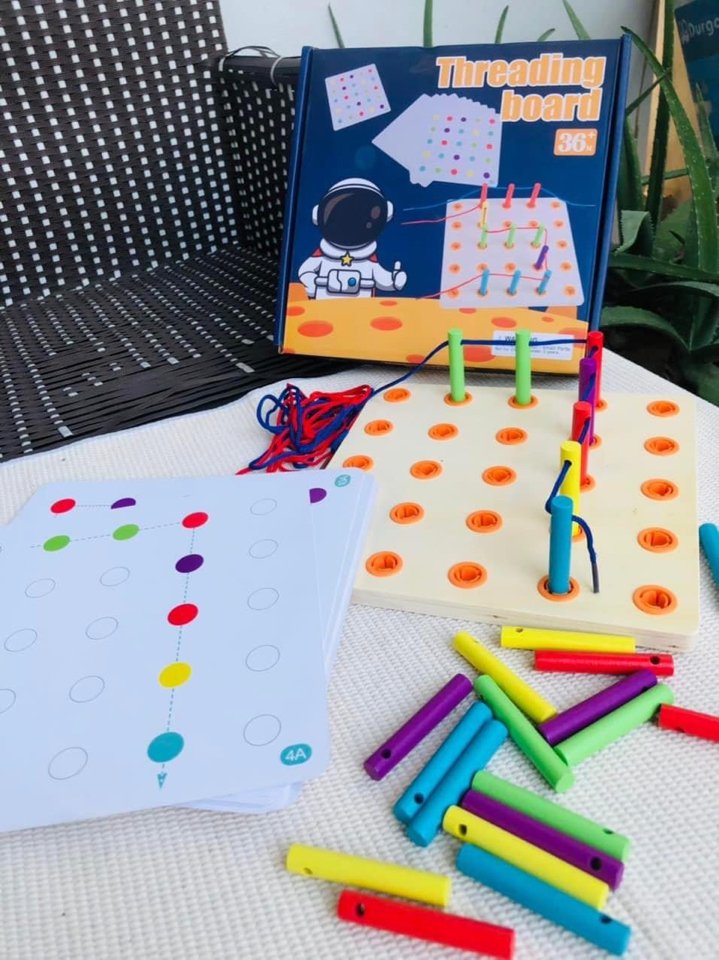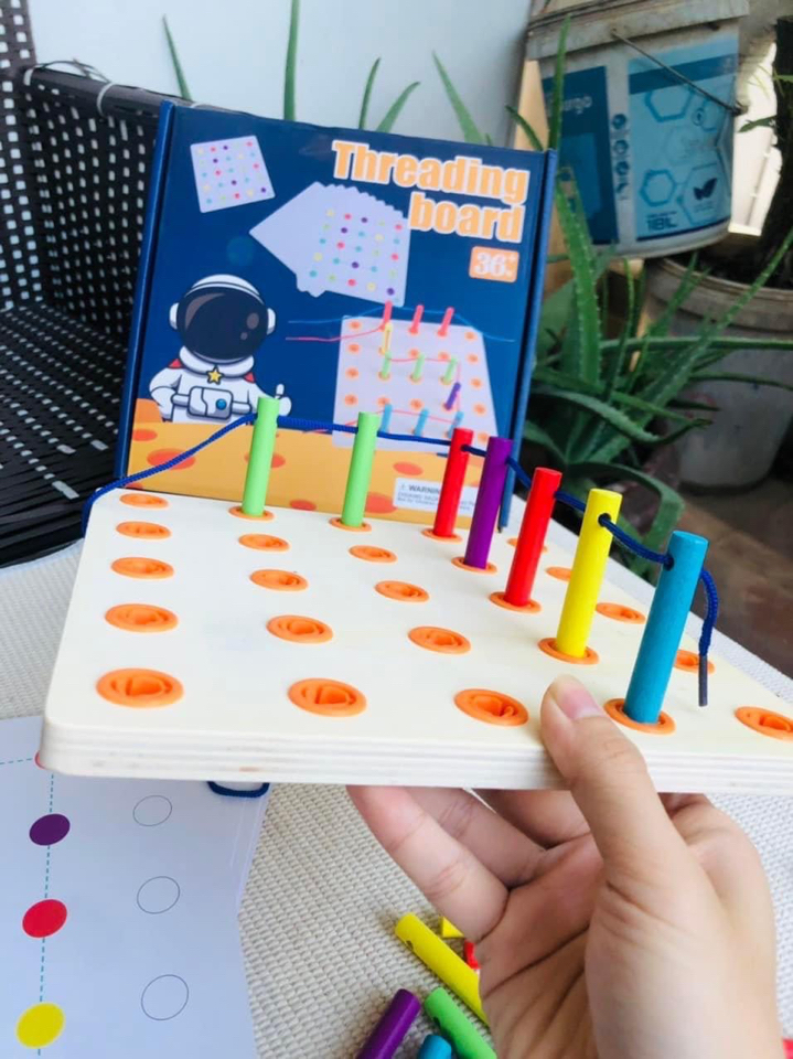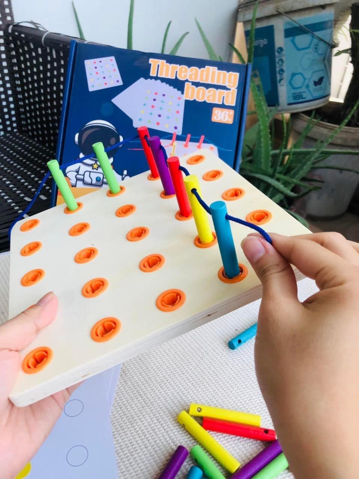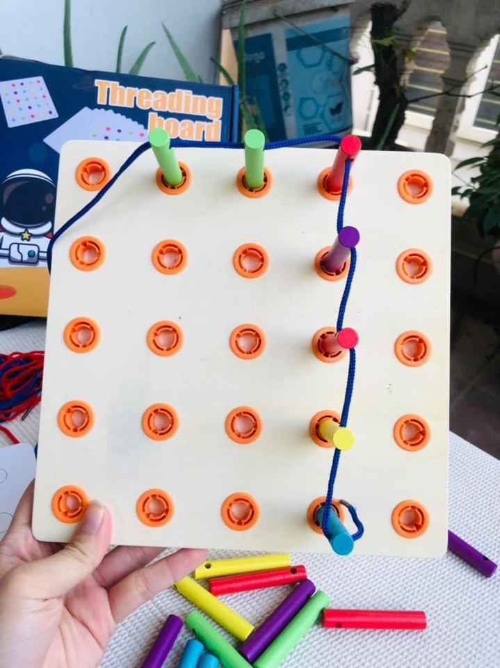 - Phát triển kỹ năng vận động tinh: Việc luồn dây qua các lỗ nhỏ trên bảng gỗ giúp trẻ rèn luyện kỹ năng vận động tinh, đặc biệt là khả năng phối hợp tay và mắt.