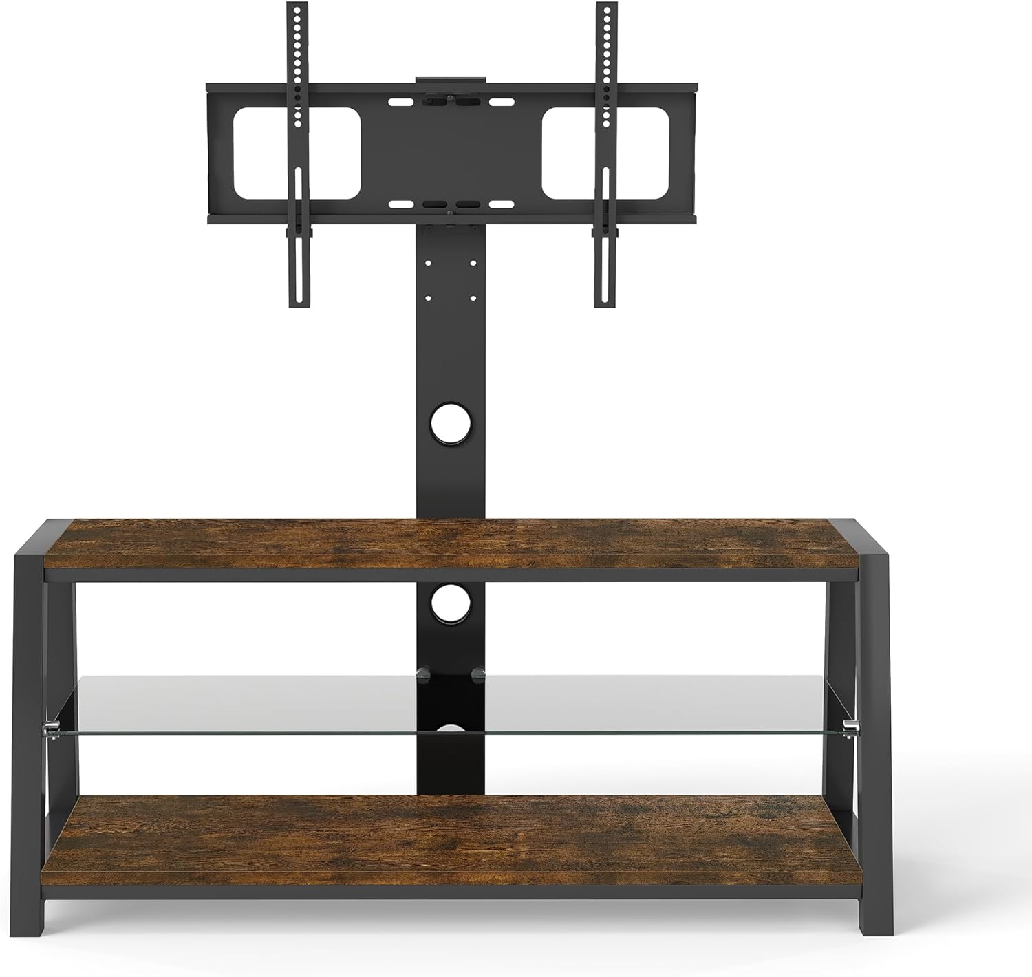 Elevate your home entertainment setup with this versatile TV stand featuring an integrated mount system. The striking combination of rustic brown wood and black metal frame creates an industrial-modern aesthetic that complements any decor style. This 3-tier entertainment center offers ample storage space with its tempered glass middle shelf and wooden surfaces, perfect for organizing gaming consoles, cable boxes, books, and other media accessories. The height-adjustable universal mount ensures optimal viewing angles for your TV, while the swivel functionality allows you to direct the screen wherever needed. The robust construction provides stable support, while the thoughtful cable management system keeps wires tidy and organized. The spacious shelving accommodates various entertainment components while maintaining a clean, uncluttered look. Whether you're setting up a living room, bedroom, or media room, this TV stand combines functionality with sophisticated style to create an impressive focal point for your space.